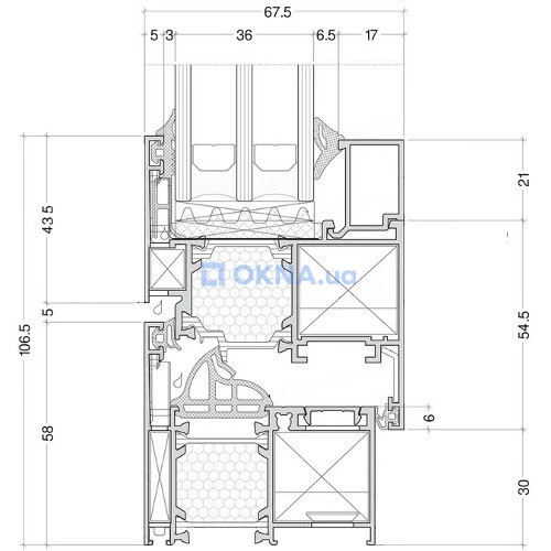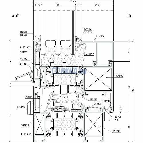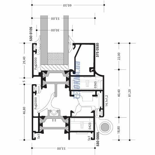 Алуминиева система с конструктивна ширина от 53 мм. (външни стени с дебелина 1,5 мм.) и широчина на прекъснатият термо мост от 24 мм. Оборудване с двоен стъклопакет или термопанел с ширина от 24 мм. до 36 мм.