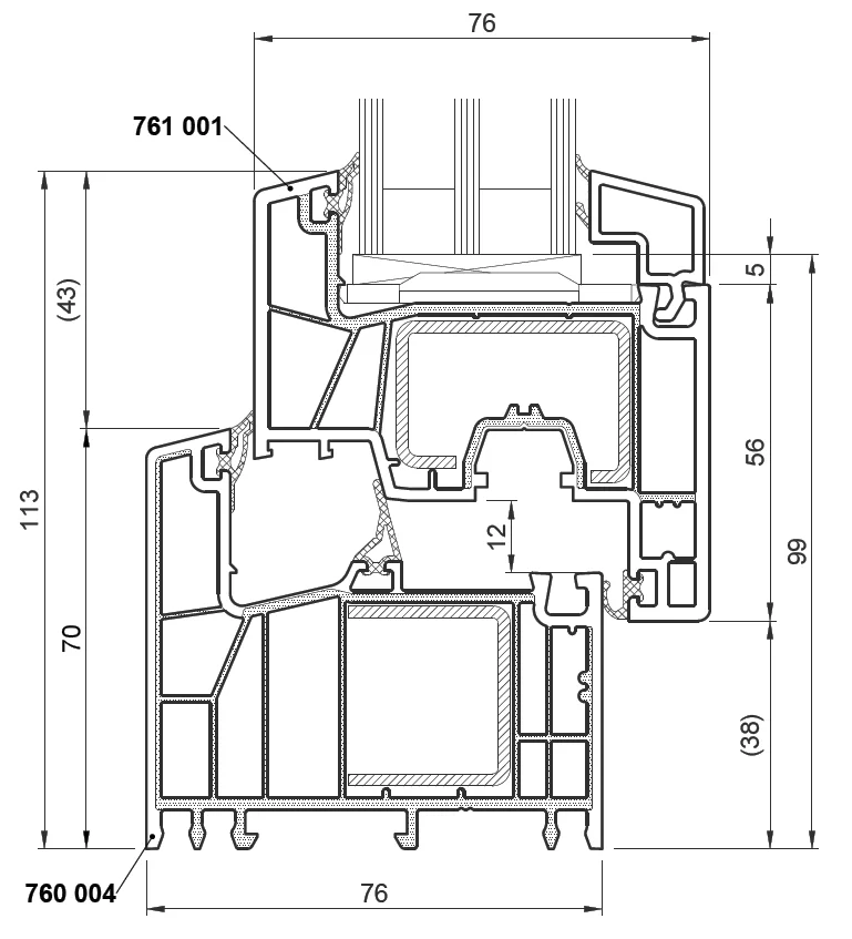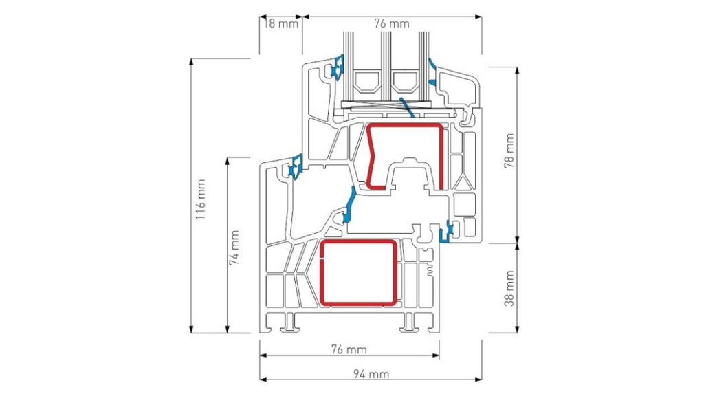 Профилна система с конструктивна ширина от 76 мм. (външни стени с дебелина 3 мм.), 6 камери в касата и 6 в крилото, и метални усилващи профили с дебелина от 1,5 мм. - 2 мм. Оборудва се с двоен или троен стъклопакет или термопанел с ширина от 24 мм. до 48 мм.