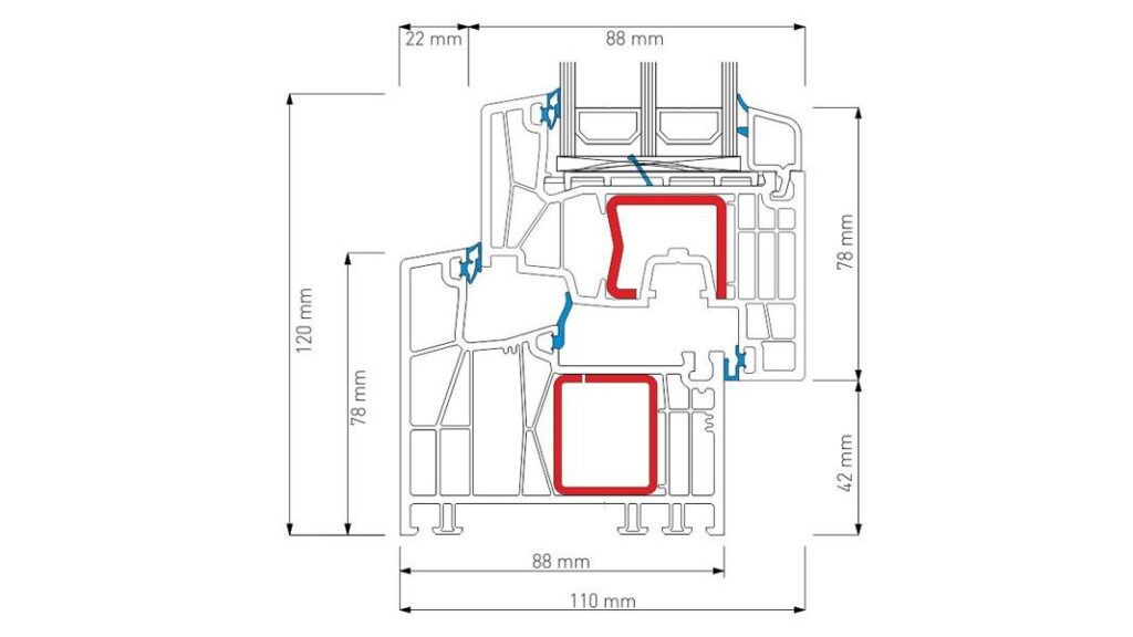 Профилна система с конструктивна ширина от 88 мм. (външни стени с дебелина 3 мм.), 7 камери в касата и 7 в крилото, и метални усилващи профили с дебелина 2 мм. Оборудва се с троен стъклопакет с ширина до 60 мм.