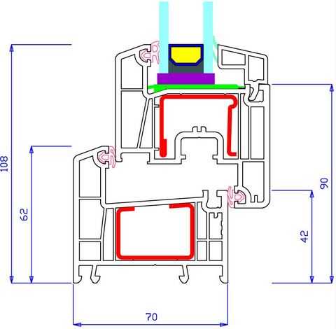 Профилна система с конструктивна ширина от 70 мм. (външни стени с дебелина 2,7 мм.), 5 камери в касата и 5 в крилото, и метални усилващи профили с дебелина 1,5 - 2 мм. Оборудва се с двоен или троен стъклопакет с ширина от 24 мм. до 36 мм., или термопанел.