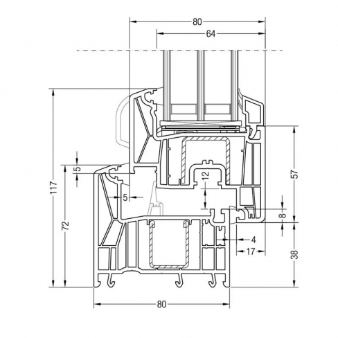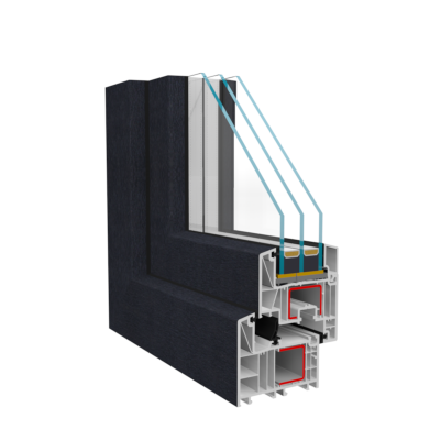 Профилна система с конструктивна ширина от 80 мм. (външни стени с дебелина 2,7 мм.), 7 камери в касата и 6 в крилото, и метални усилващи профили с дебелина 2 мм. Оборудва се с троен стъклопакет с ширина 42 мм.