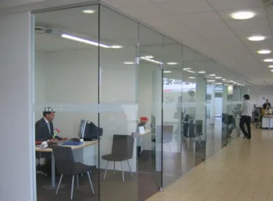 Стъклените витрини са добро решение за вътрешно разделяне на офис-площи или магазинни помещения. Изработват се стандартно от тесен, еднокамерен алуминиев профил и единично стъкло, което най-често е с дебелина 10 или 8 мм. Стъклата могат да бъдат прозрачни или матирани. Стъклата за този тип витрини се кантират по краищата с цел безопасност и отнемане на напрежението при среза. При нужда за по-голяма безопасност при по-големите размери стъклото може да се закали или да се залепи фолио, чиято функция е да заздрави стъклото и да обезопаси средата при счупване. Поради това че този тип остъкляване е с единично стъкло, а не със стъклопакет, топло- и звукоизолационните свойства не са особено добри. Вратите, които се изработват, са задължително със закалено и кантирано стъкло. Обковът стандартно е с панти, работещи в двете посоки (навън и навътре), тръбна дръжка или топка и подов автомат. За монтажа на подовия автомат е необходимо предварително да се предвиди отвор в пода на определеното място. Ако няма такъв, се изкопава допълнително.